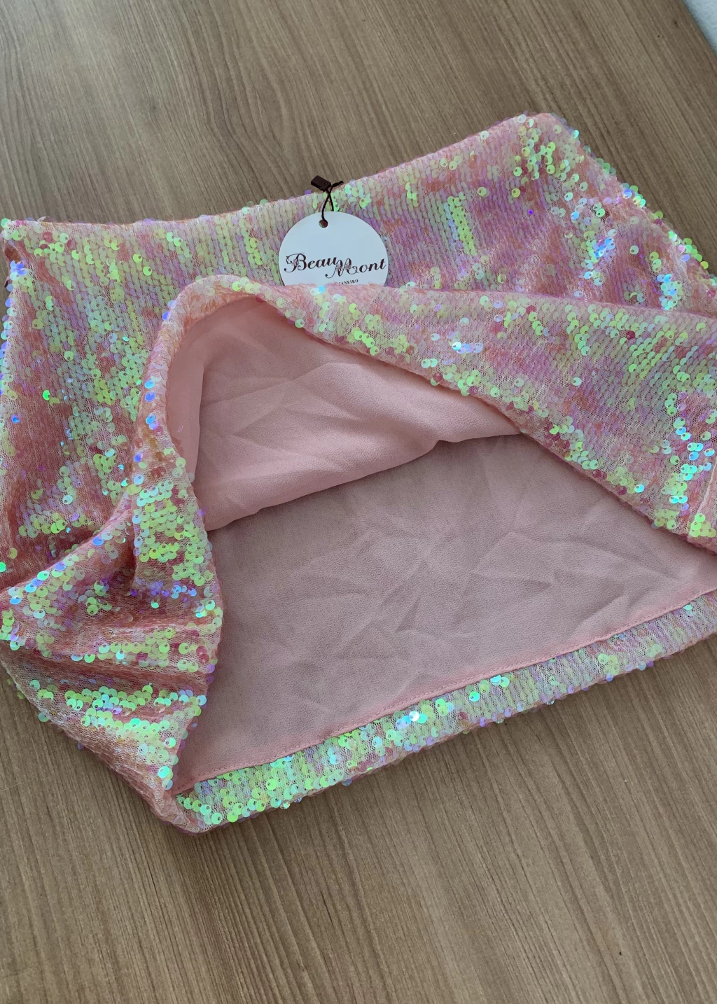 A saia é confeccionada em um paetê holográfico rosa, muito chic e único e possui forro de chiffon toque de seda que traz um conforto especial para a peça!